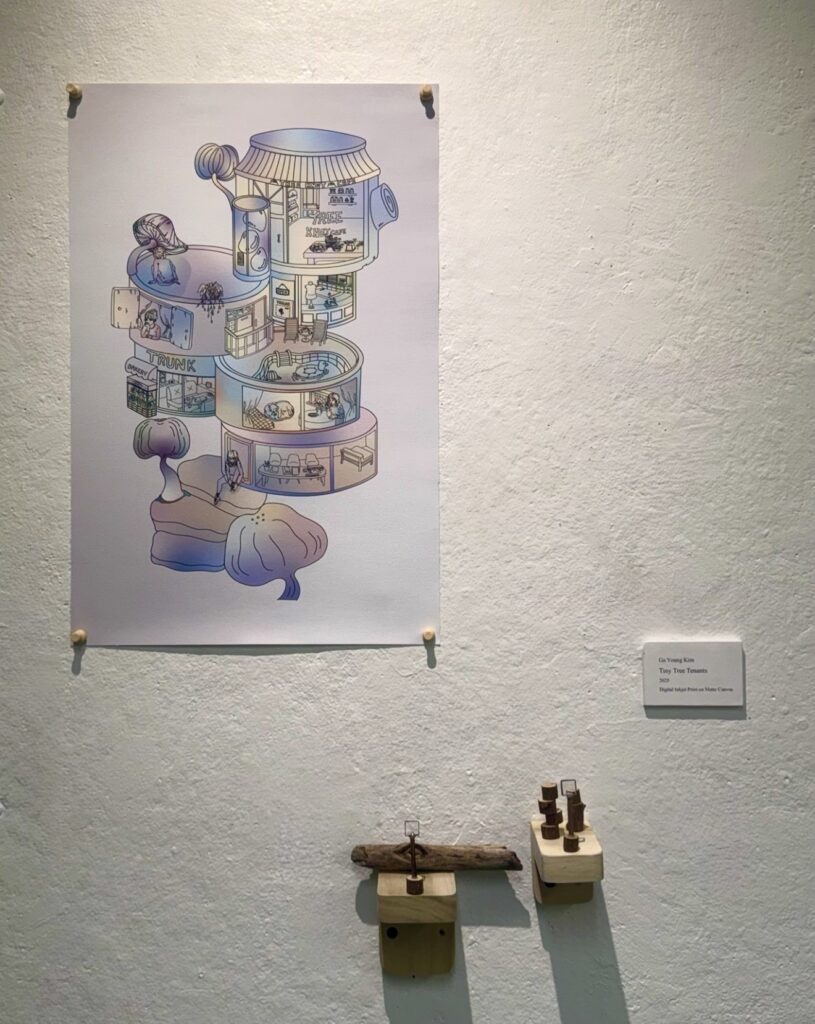 As I walked past trees, I often wondered whether the knots in their trunks might contain entire different worlds. If tiny people lived inside the wood, and their windows appeared to us as knots or cracks, what kinds of lives would they be living? This idea began as a simple curiosity. I once tried expressing it through a wood-based artwork, but because the concept involved a storyline, it was difficult to fully convey it with small drawings alone. For this project, I decided to revisit that earlier idea and combine it with digital media.