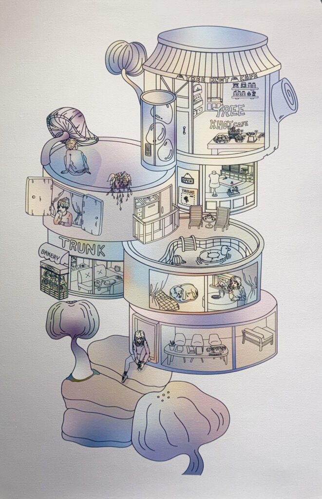 If people were living inside a tree, each would have their own daily life. But considering that a tree generally has a cylindrical, vertical form, I imagined their lifestyle resembling the structure of an apartment building. With an elevator-like core at the center, these residents would use it not only for moving between floors but also for transporting the tree’s energy and moisture essential for living. Although they could come outside the tree, the risk would be high, so I imagined that everything—places to eat, rest, and learn—would exist inside the trunk. Based on this, I created the following drawing. The environment inside the tree is influenced by sunlight, the tree’s primary source of energy. I used the colors of a light prism as the foundation for the overall coloration.